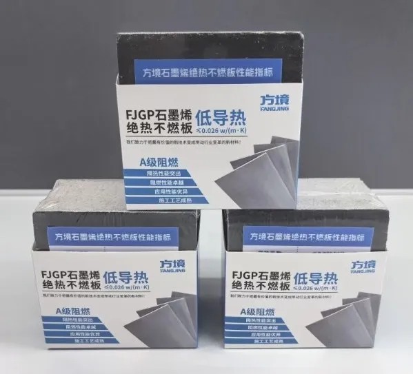 石墨烯絕熱不燃板是以改性聚氨酯硬泡、高阻燃含氮有機高分子材料為基體,按特定配比引入耐高溫無機粉料和石墨烯包裹的核心阻燃劑等,經(jīng)界面改性及預分散,在特定溫度下均勻混合,通過催化、發(fā)泡及固化工藝制成的板面帶有纖維布界面層、具有閉孔結(jié)構(gòu)的均質(zhì)高絕熱不燃保溫板,簡稱FJGP板。導熱系數(shù)小于0.026W/(m·K),密度小于130kg/m3,A級防火。