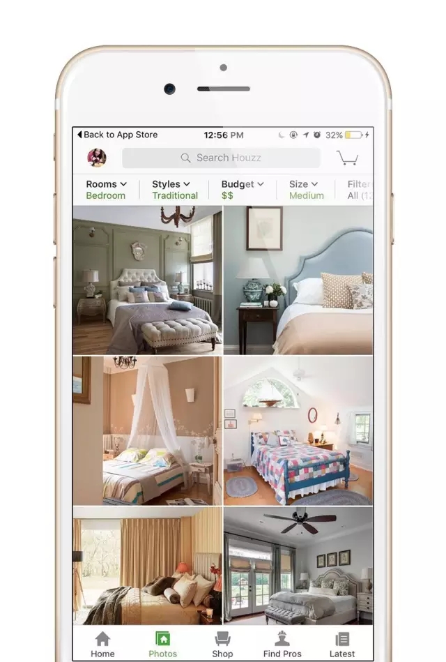 回到主頁面,在“Photos”一欄中,你可以根據(jù)自己的需求找家裝靈感~比如小探設(shè)了篩選條件:臥室、傳統(tǒng)風(fēng)格、中等價(jià)位、中等大小的房間。就可以看到篩選后的案例圖啦~