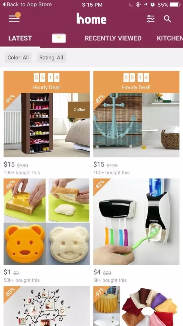 Wish是美國廉價(jià)電商的典范,而他們針對家裝市場做的垂直應(yīng)用Home也主打廉價(jià)商品,你可以在這兒買到各種比本地商店便宜的、好玩有趣的家具、家裝用品。每小時(shí)還有幾款產(chǎn)品會(huì)有巨大的折扣,老美也是愛淘便宜貨的呀。