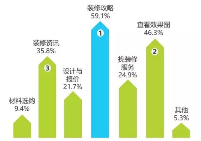 互聯(lián)網(wǎng)家裝用戶在線上使用的服務(wù)主要集中在查看裝修攻略、效果圖和獲取裝修咨詢這類參考信息型服務(wù),也逐漸涉及找裝修服務(wù)、涉及與報(bào)價(jià)、材料選購(gòu)這樣的交易型服務(wù)。線上交易與線下裝修結(jié)合構(gòu)成互聯(lián)網(wǎng)家裝閉環(huán)。