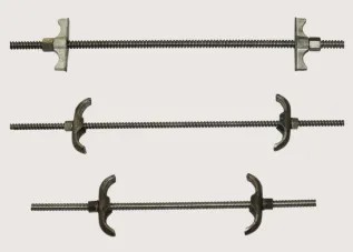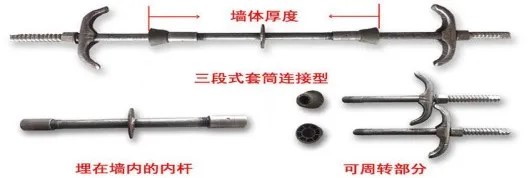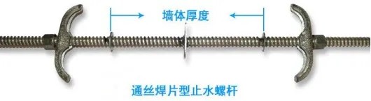 對拉螺桿多用于豎向構件模板的加固桿件,另兩端均配設固定件(山形帽或成品鐵板墊塊)和螺帽限位,起到固定模板的效果。目前市場螺桿的種類繁雜,一般用于房建工程的螺桿均采用Q235的圓鋼進行滾絲制作,直徑為M14(鋁模除外,其采用Tr18型),長度根據(jù)相應墻厚進行配設。根據(jù)豎向結構防水要求將螺桿主要分為通絲螺桿和止水螺桿。