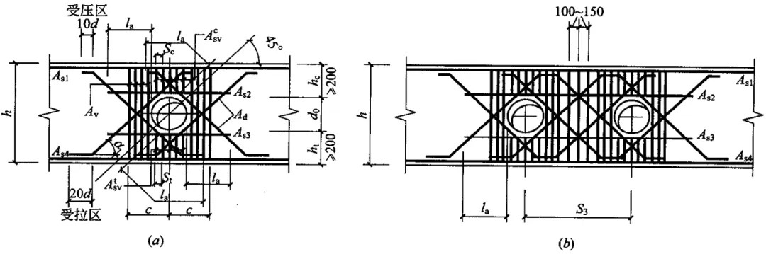 梁上開洞,因為改變了梁受力特性,因此必須采用附加筋補強措施,設計進行力學計算后出具大樣圖,嚴格依圖施工。某項目水管和風管穿梁開洞構(gòu)造示意圖: